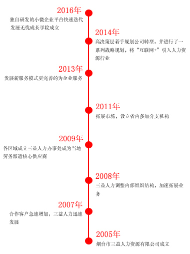 2008年8月,鄄城縣三益人力資源開發(fā)有限公司正式成立,鄄城公司的成立為公司今后的發(fā)展發(fā)揮重要作用。煙臺三益人力資源有限公司總部于2009年07月06日在煙臺工商局注冊成立。在公司發(fā)展壯大的10年里,我們始終為客戶提供好的產(chǎn)品和技術(shù)支持、健全的售后服務(wù)。公司先后在三十里堡、科信大廈、業(yè)達智慧谷、天宇市場開設(shè)了店鋪。2017年3月,三益威海分公司成立,大大拓寬了我們的國內(nèi)市場。